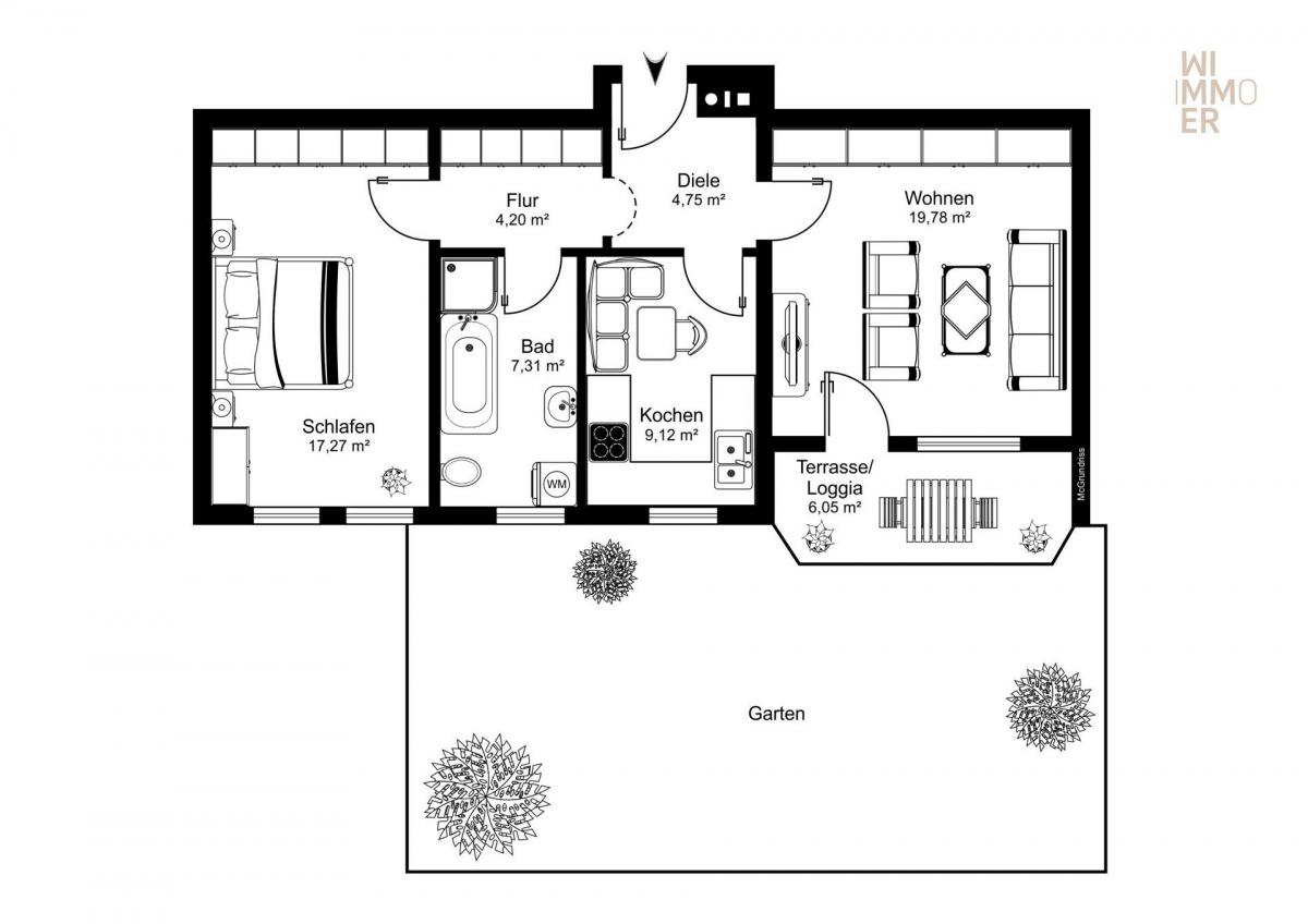 Nach dem Betreten der Wohnung befinden Sie sich in einem kleinen Flur, welcher linker Hand in das geräumige Wohnzimmer mit Zugang zur Südterrasse und dem Garten führt. Geradeaus erreichen Sie die Küche. Rechter Hand führt der Eingangsbereich in einen weiteren Flur, der in die weiteren Räumlichkeiten führt. Links befindet sich das Tageslichtbadezimmer, welches mit WC, Waschbecken, Badewanne, Dusche und Waschmaschinenanschluss ausgestattet ist. Geradeaus erreichen Sie das großzügige Schlafzimmer.