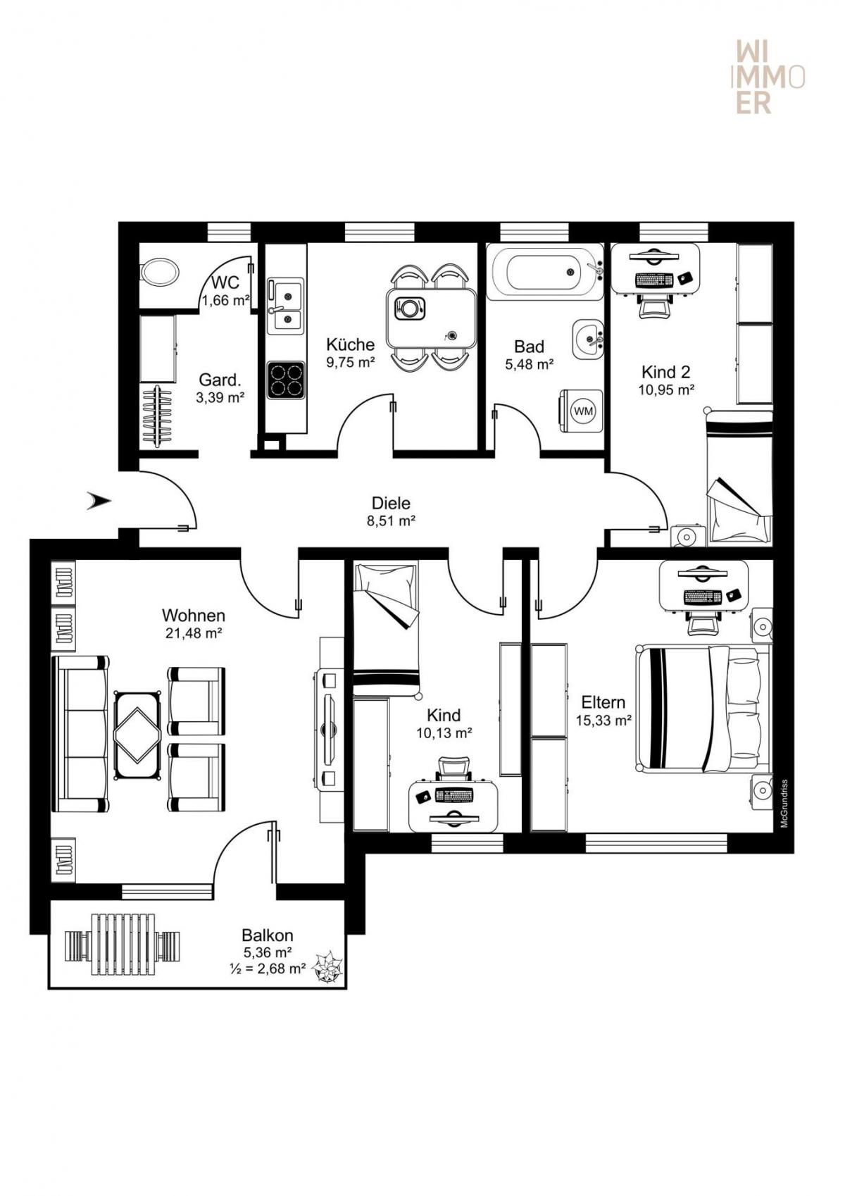 Nach dem Betreten der Wohnung befinden Sie sich im Eingangsbereich, welcher rechter Hand in das geräumige Wohnzimmer mit Zugang zum Balkon führt. Daran angrenzend befindet sich das erste Kinderzimmer und das Elternschlafzimmer. Diese drei Räume und der Balkon sind gegen Süden ausgerichtet. Geradeaus führt der Flur in das zweite Kinderzimmer, welches selbstverständlich auch als Büro genutzt werden kann. Linker Hand finden Sie nach dem Eintritt in die Wohnung eine kleine Garderobe sowie das WC. Daran schließt sich die Küche sowie das Tageslichtbadezimmer an, welches mit Badewanne, Waschbecken und Waschmaschinenanschluss ausgestattet ist.