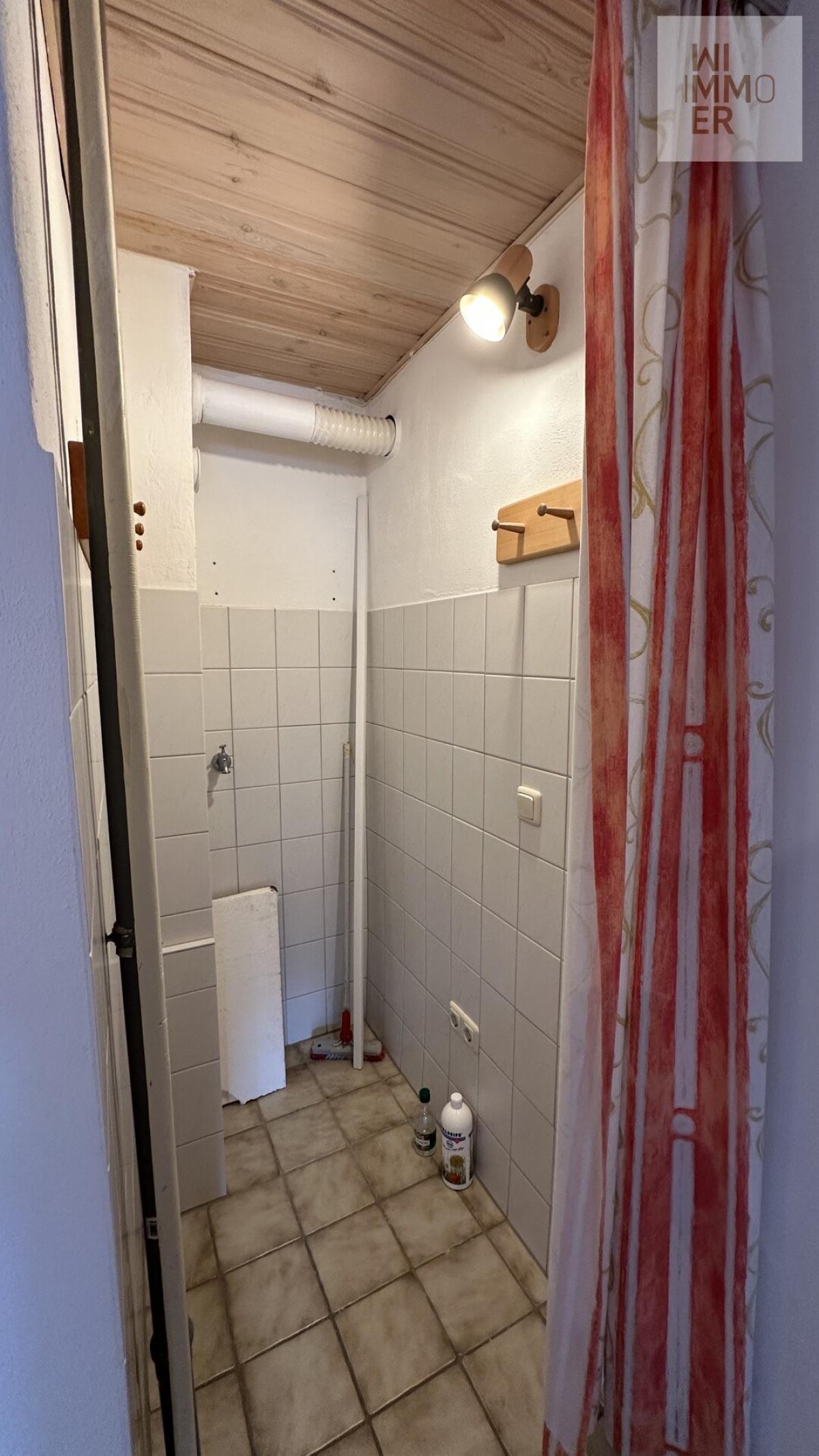 Ebenfalls von der Nordseite zugänglich, empfängt Sie ein länglicher Flur. Im Erdgeschoss befinden sich ein Badezimmer, eine Küche mit älterer Einbauküche sowie ein Wohnzimmer mit direktem Zugang zum überdachten Freisitz, der Terrasse und dem idyllischen Garten.