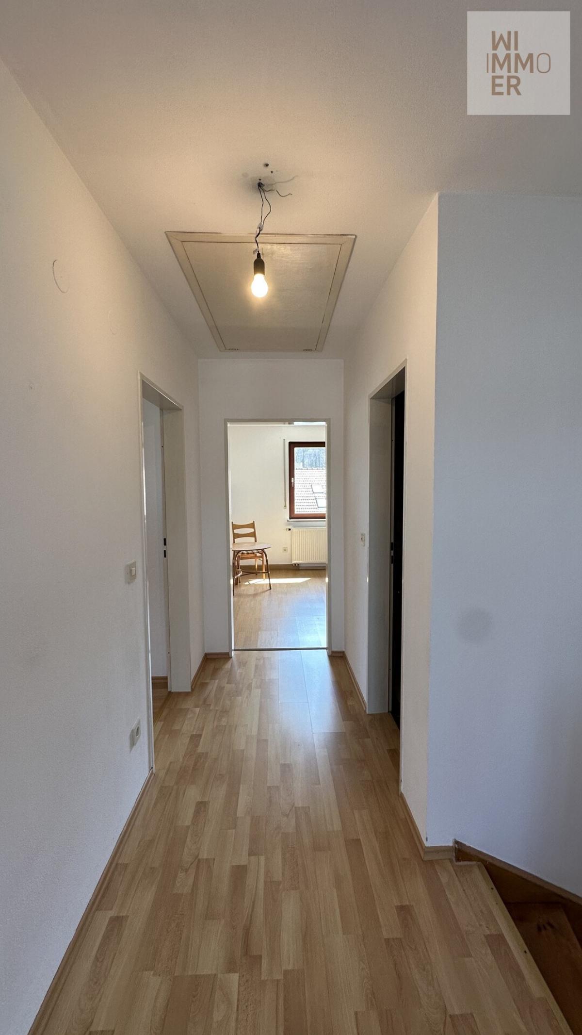 Im Obergeschoss stehen Ihnen zwei helle Zimmer und ein weiteres Badezimmer zur Verfügung. Von hier aus erreichen Sie auch das ausbaufähige Dachgeschoss.